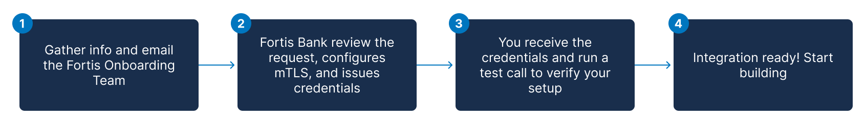 This guide provides a step-by-step checklist to connect your systems with Fortis APIs. You will learn how to request access, configure your environment with mTLS, and make your first successful API call to verify your setup.